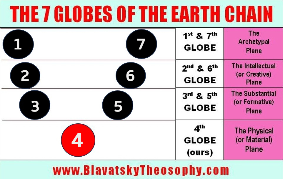 * Our Earth evolution consists of numerous successive Chains, each of which is comprised of 7 Globes as shown in the diagram.