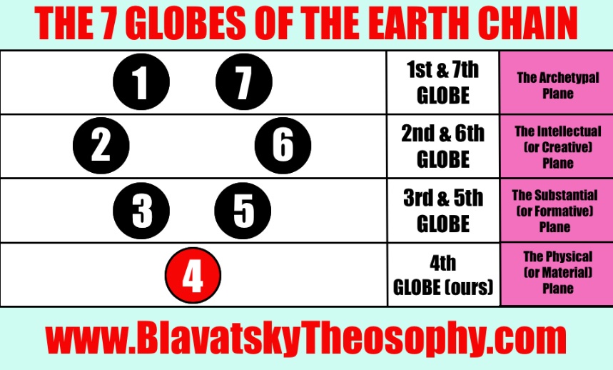 * Our Earth evolution consists of numerous successive Chains, each of which is comprised of 7 Globes as shown in the diagram.