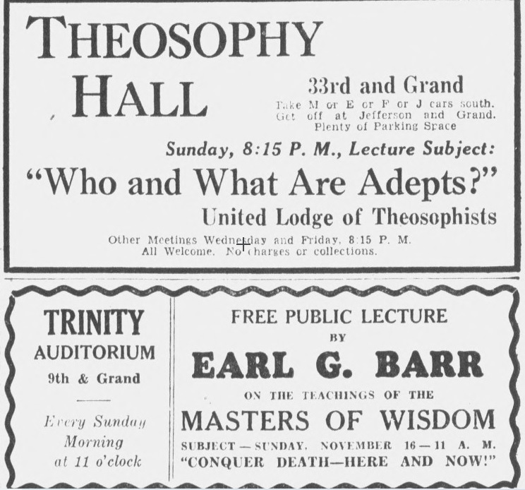 The advertisement on the right is from the 15th November 1930 issue of the Los Angeles Daily News. It announced Barr’s upcoming talk titled “Conquer Death – Here and Now!” and was accompanied by a paragraph which read: “EARL BARR LECTURES ON MASTERS’ WISDOM. Earl G. Barr lectures on the teachings of the “Masters of Wisdom” every Sunday at 11 a.m. in the Trinity auditorium. These free lectures are given with the purpose of establishing a renaissance of culture, as Barr’s work is intended primarily as an introduction to the more rational standards of living and thinking which, if applied to twentieth century problems, would result in a re-establishment of truth, order and beauty as the criteria of human procedure.”