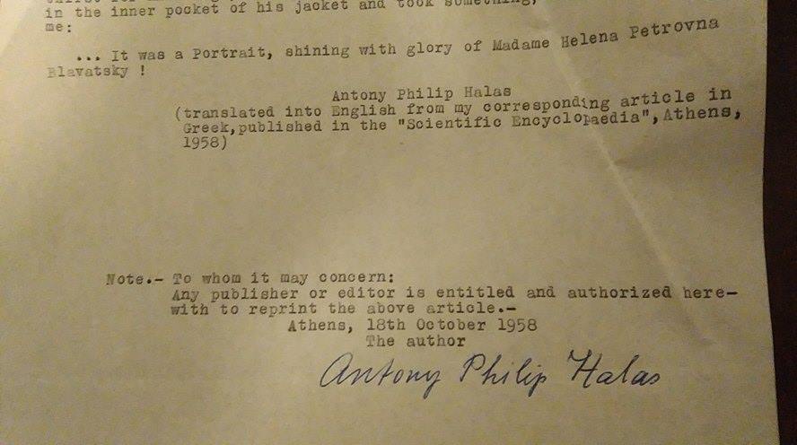 of Theosophists in London, England. Antony Philip Halas, who lived in Athens, Greece, was for some years in written communication with the London ULT, having become a ULT associate in 1954. This particular letter of his was undated but was affixed to other letters dating from 1965-1966. We make no interpretation or explanation of Mr. Halas’ account but leave that entirely to the reader.