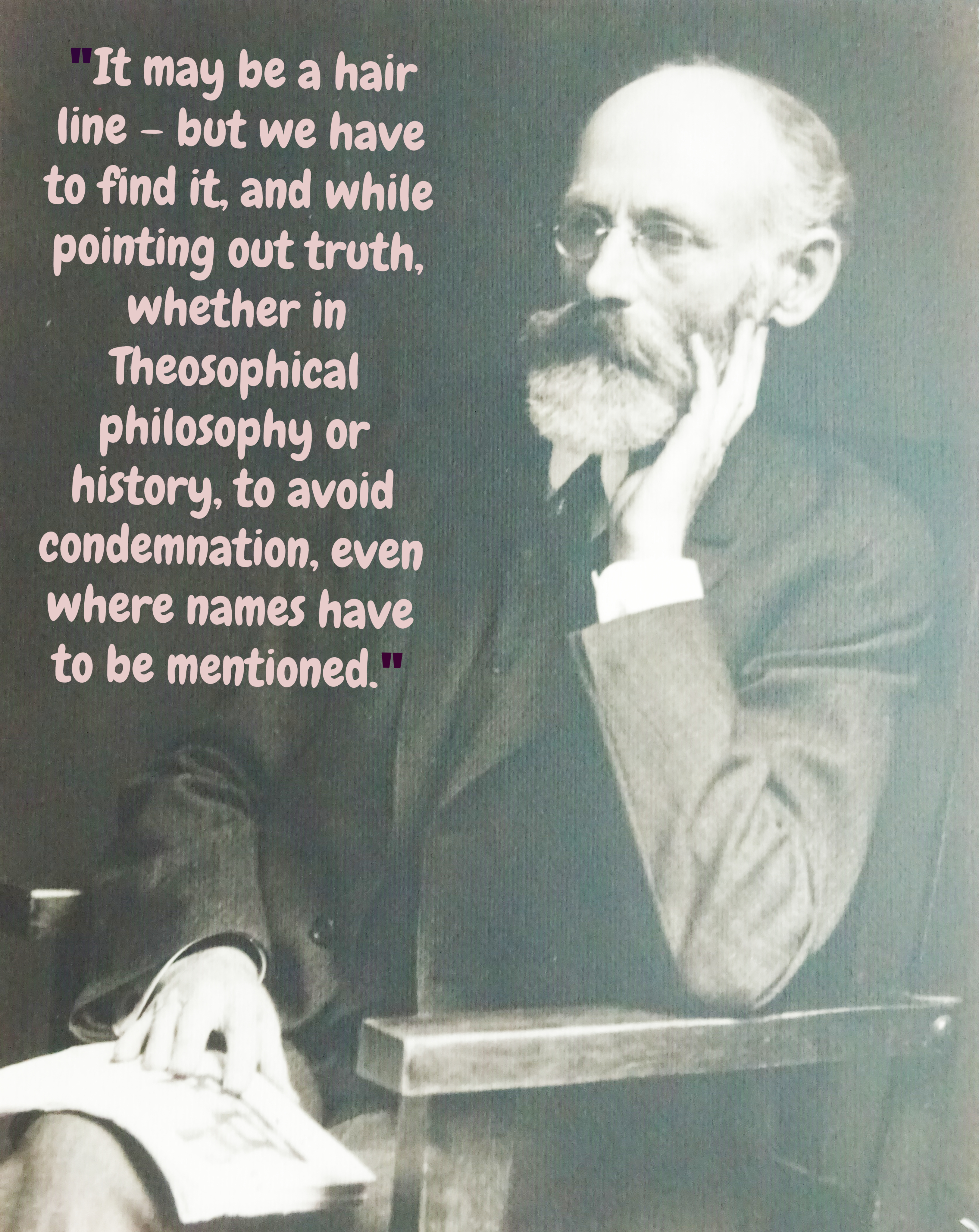“In Mrs. Tingley there is apparent lack of sincerity, and much that is the opposite of theosophical conduct. When questions are asked, and when occasion compels it, plain statements of fact have to be made, but in defense of Theosophy, not in condemnation of any person. This is our key to a right attitude in all such cases presented by theosophical history, made or in the making. It may be a hair line – but we have to find it, and while pointing out truth, whether in Theosophical philosophy or history, to avoid condemnation, even where names have to be mentioned.”