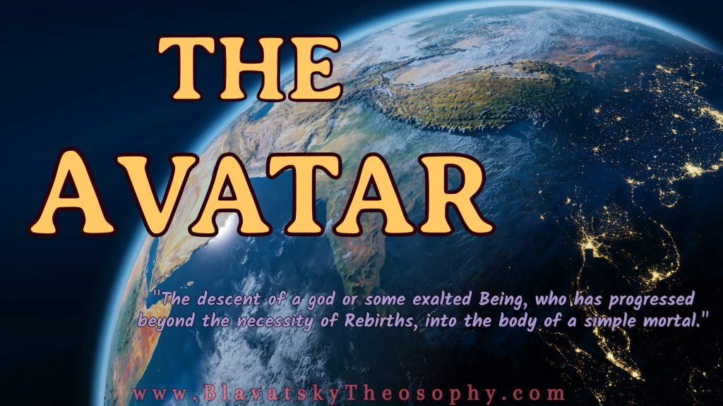 Notice the wording of the first quote above: an Avatar is “The descent of a god or some exalted Being, who has progressed beyond the necessity of Rebirths, into the body of a simple mortal.”