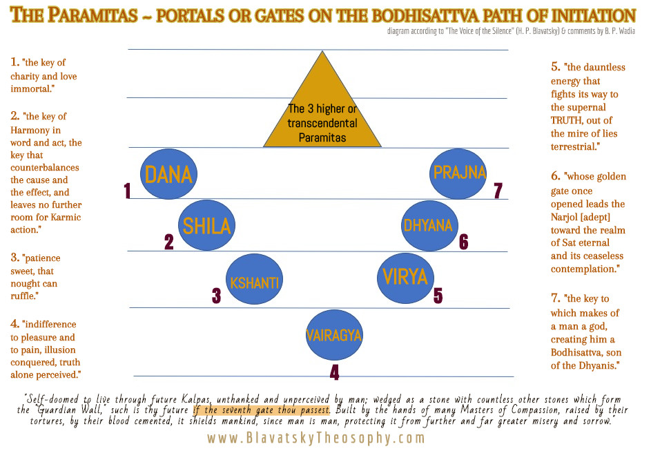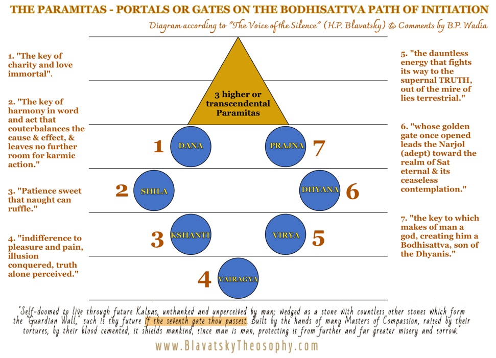 In the Trans-Himalayan Esoteric School of pure Buddhism, it is revealed that there are seven Paramitas, the fourth and therefore central one – Viraga or Vairagya (dispassion) – being missed out of the enumeration of the Paramitas by the publicly known forms of Buddhism. But “The Voice of the Silence” also occasionally mentions ten Paramitas, implying that there are an additional three beyond the seven of which it specifically speaks.