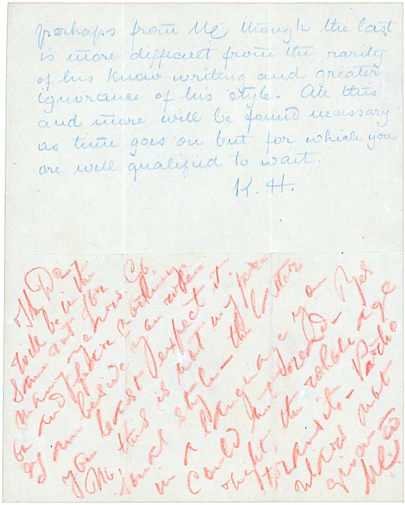“I wonder if this note of mine is worthy of occupying a select spot with the documents reproduced, and which of the peculiarities of the “Blavatskian” style of writing it will be found to most resemble? The present is simply to satisfy the Dr. that – “the more proof given the less believed”. Let him take my advice and not make these two documents public. It is for his own satisfaction that the undersigned is happy to assure him that The Secret Doctrine when ready, will be the triple production of M, Upasika and the Doctor’s most humble servant. – K.H.”