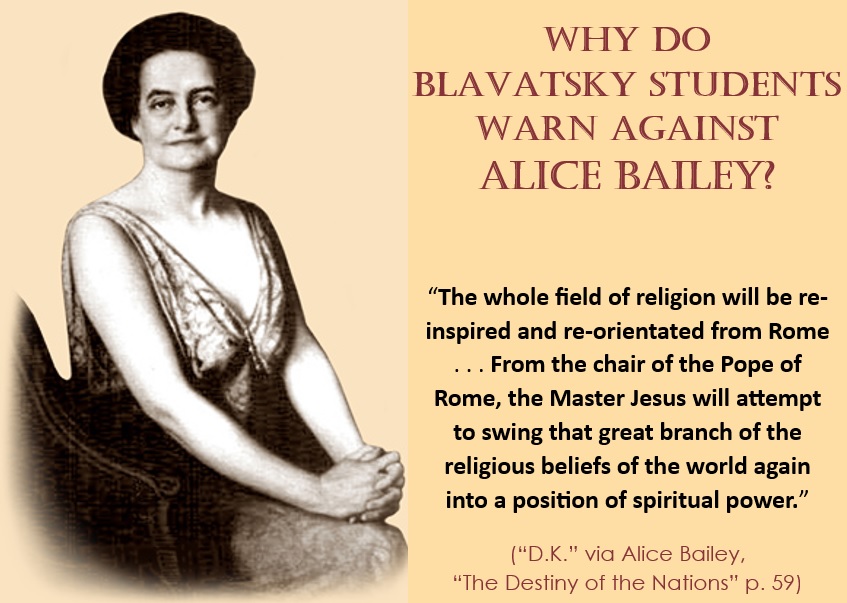 We would like to clarify that both this article and Tibetan Master or Christian Priest? were in fact written by someone who had initially been a very serious and devoted student of the Bailey teachings (even down to promoting those teachings online and involvement in “triangles” and the full moon meditations, etc.) but who then began to read H. P. Blavatsky and research into the history of the Theosophical Movement and whose conscience could then no longer allow themselves to continue with Bailey nor to keep silent about her deceptive and anti-theosophical ideas.